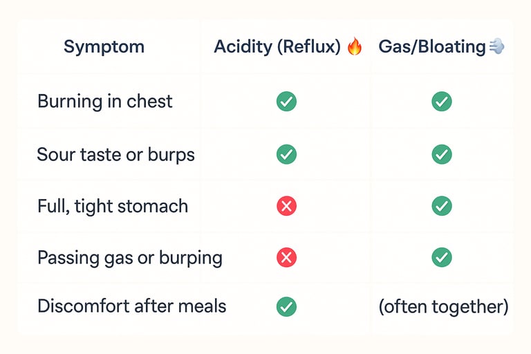 Have you ever felt a burning sensation in your chest… along with a tight, bloated stomach? You're not alone. Many people use the terms acidity and gas interchangeably, but they’re actually two different issues — and they often show up together.